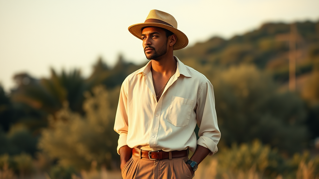 The image shows a man with his hands casually in his pockets, drawing inspiration from Eugène Brands. This photo might have been shared on Instagram as part of a Dior editorial. It embodies a retro summer vibe with its nostalgic color palette. The man bears a resemblance to Lance Reddick and dons loose-fitting clothing complemented by a stylish hat. The photo echoes the elegance of a Hermes advertisement and encapsulates the essence of 2020 fashion trends. It could easily have found its place in a Vogue France lookbook or profile, with distinct influences from 1950s style. The image might be evocatively titled "Serene Spirit."
