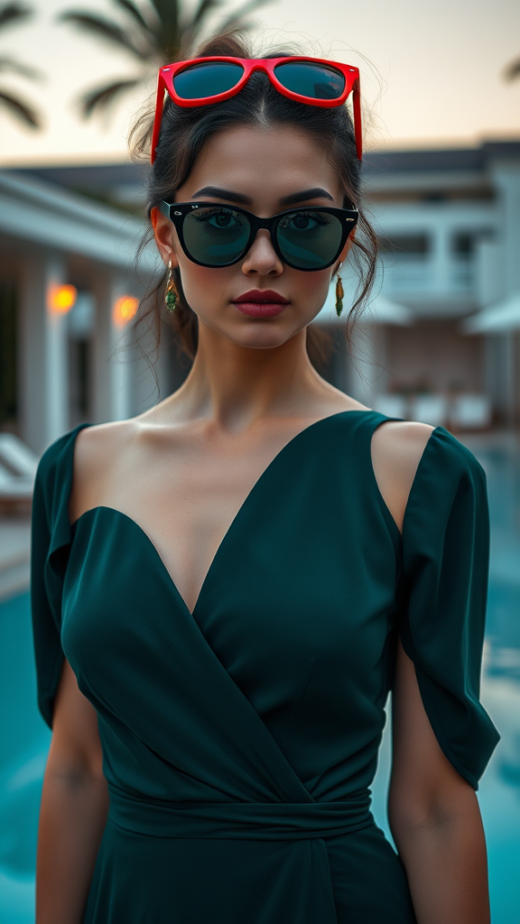 The image shows a striking woman in an elegant dark emerald dress, evocative of an album cover, with influences reminiscent of Elsa Bleda's style. Her eyes are framed by chic Ray-Ban glasses, contrasting with playful neon shades perched on her head, injecting an unexpected vibrancy into her sophisticated ensemble. The dress, a work of modern artistry, wraps her form with bold color blocking, a nod to contemporary fashion trends. Ideal for a stylish night out, the attire is accentuated by exquisite green jewelry that harmonizes with the dress's rich hue. Set against the backdrop of an opulent resort, the photograph benefits from the artful eye of photographer Julian Ope. The woman exudes an allure akin to that of singer Dua Lipa or actress Stoya. pureerosface_v1 easynegative ng_deepnegative_v1_75t bad-picture-chill-75v badhandv4.