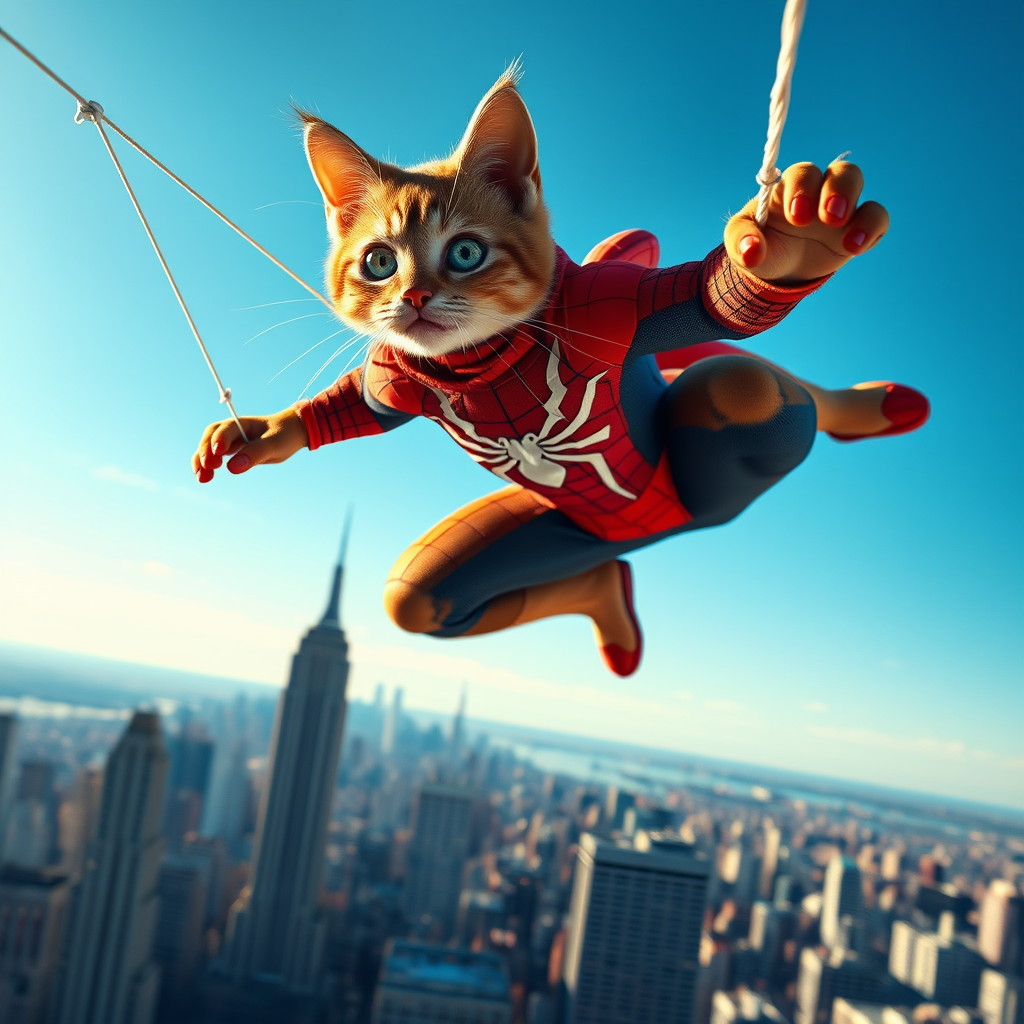 The incredible SpiderCat, a feline superhero clad in a custom Spider-Man suit, gracefully soars above the iconic skyline of New York City, skillfully swinging from skyscraper to skyscraper using gossamer webs. The scene is captured in breathtaking hyperrealism, boasting 32k UHD resolution with cinematic lighting that highlights every intricate detail. This masterpiece showcases the perfect blend of fantasy and reality, capturing the essence of heroism with immaculate detail and high resolution, in a stunning vertical frame.
