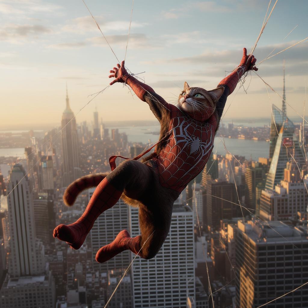 The incredible Spidercat, a feline superhero clad in a Spider-Man costume, soaring gracefully over the New York City skyline with its web, ultra-realistic, 32k UHD clarity, dramatic lighting, intricate detailing, exquisite resolution, a true masterpiece, with a 5:7 aspect ratio. The scene captures the early evening glow, casting long shadows and highlighting the dynamic pose of Spidercat mid-swing, with the cityscape unfolding beneath, teeming with life and vibrancy. The wind ruffles the costume's fabric, bringing a sense of motion and energy, as the iconic skyscrapers twinkle in the fading daylight.