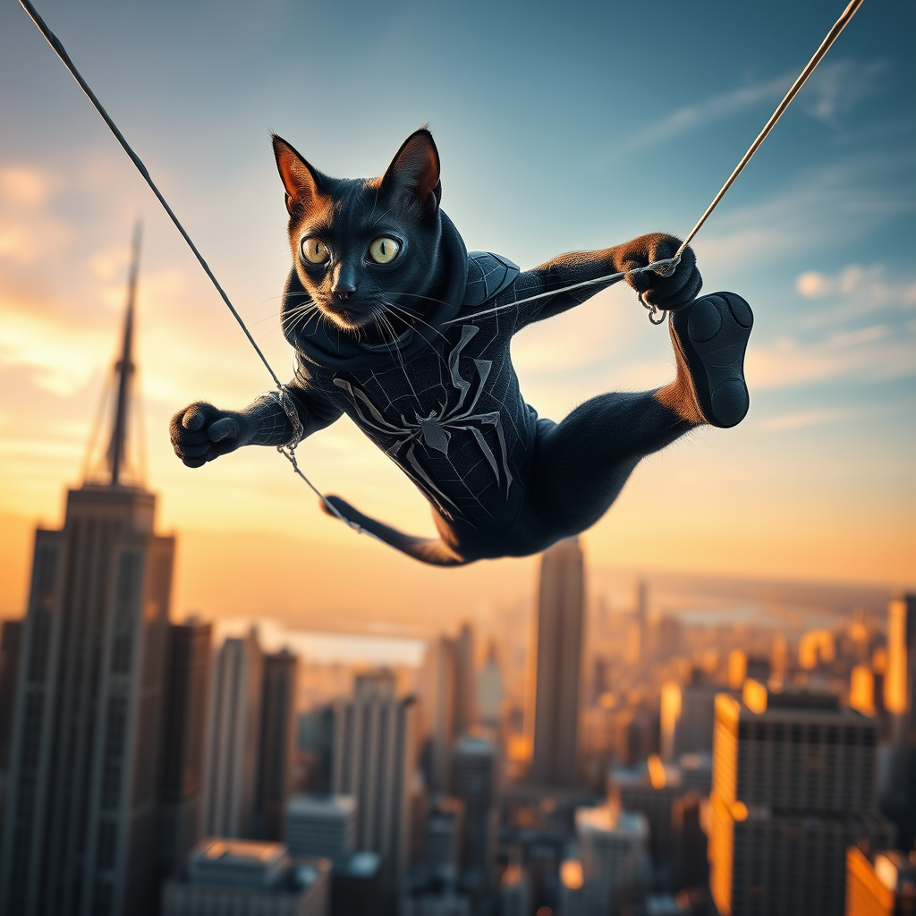 The incredible SpiderCat, a feline superhero draped in a sleek Spiderman costume, gracefully glides through the iconic skyline of New York City using his delicate web, ultra-realistic visuals, 32k ultra HD clarity, dramatic cinematic lighting, exceptionally detailed fur and suit, unparalleled resolution, a true masterpiece capturing the essence of a captivating hero -- aspect ratio 5:7.