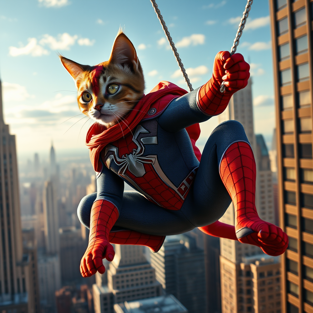 The incredible Spidercat, a heroic feline in a vibrant spiderman-inspired suit, gracefully swinging through the skyscrapers of New York City with its web. Captured in stunning hyperrealism, this 32k ultra-high-definition image showcases cinematic lighting and impeccable detail, bringing the scene to life as a true masterpiece against a grand urban backdrop.