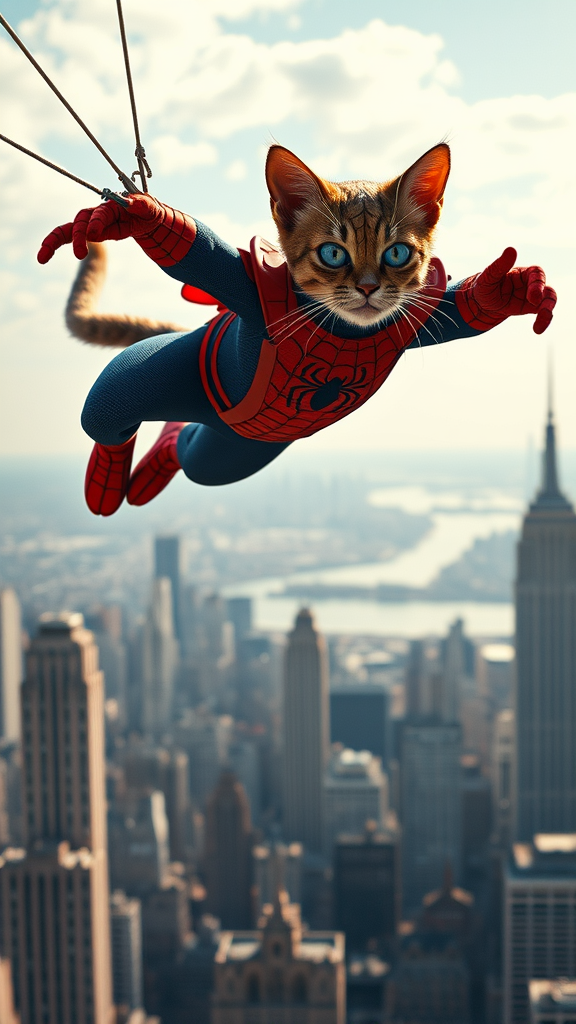 The incredible Spidercat, a superhero feline clad in a vibrant Spider-Man suit, gracefully soaring above the iconic skyline of New York City using its web-slinging prowess, captured in ultra-realistic detail, featuring cinematic lighting and meticulous precision, showcasing a masterpiece of high-resolution artistry with a striking 5:7 aspect ratio.