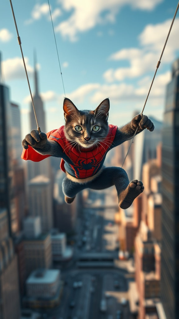 The incredible Spidercat, a superhero feline dressed in a Spider-Man costume, soars through the skies of New York City, swinging effortlessly with silky webs. Captured in hyperrealistic detail and stunning 32k UHD resolution, the scene boasts cinematic lighting and impeccable detailing, showcasing a high-resolution masterpiece of dynamic action with a backdrop of the bustling cityscape, rendered in a captivating 5:7 aspect ratio.