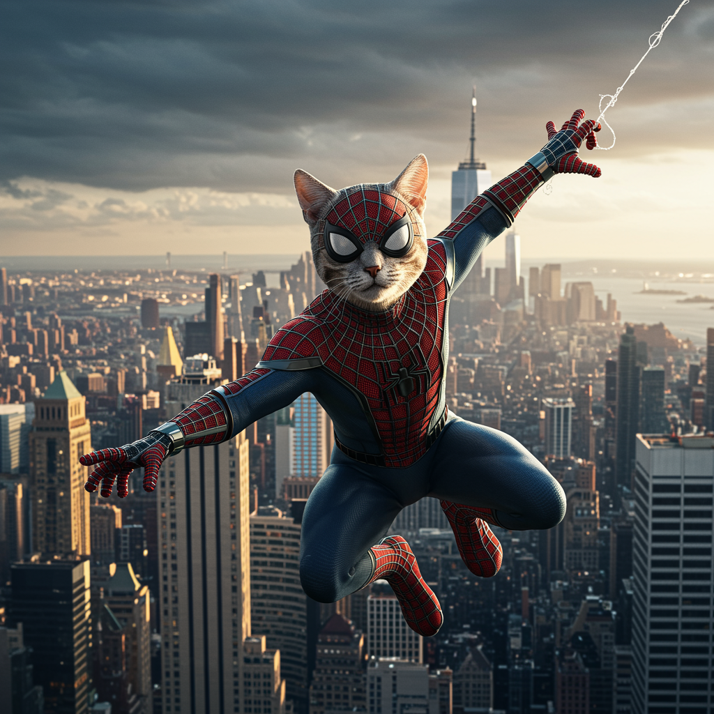 The incredible Spidercat, a superhero feline in a sleek, custom-designed Spiderman outfit, gracefully soaring above the bustling skyline of New York City, spinning webs between skyscrapers, ultra-realistic, 32k UHD quality, dramatic cinematic lighting, intricate and flawless detailing, high definition, true masterpiece, 5:7 aspect ratio.