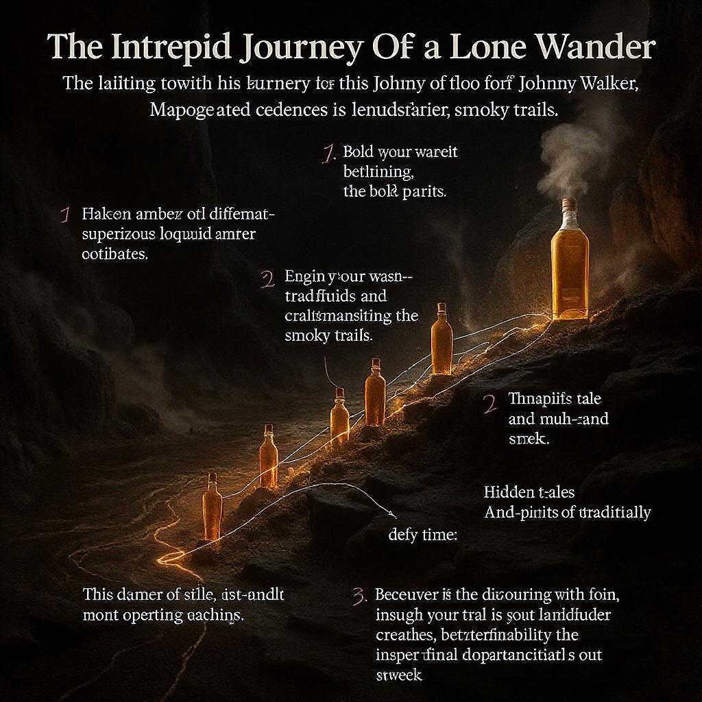 The intrepid journey of a lone wanderer named Johnny Walker, navigating through landscapes of liquid amber and smoky trails, discovering hidden tales of tradition, craftsmanship, and bold spirits that defy time.