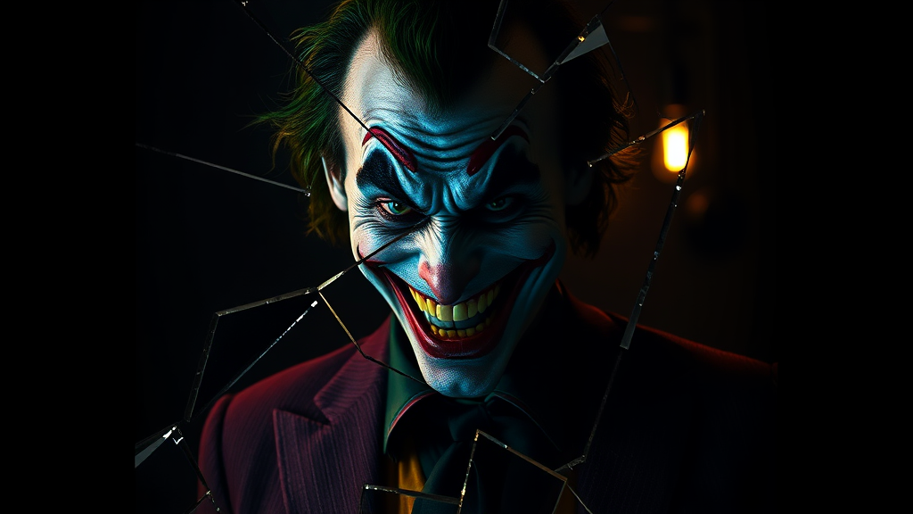 The Joker, a notorious villain from the Batman series, stands before a fractured mirror, his menacing grin reflecting back in fragmented pieces, capturing a scene heavy with Christopher Nolan's signature darkness and tension. The room is cloaked in shadow, faintly lit by a flickering bulb that casts deep, dramatic contrasts across his face. Each shard of the mirror reveals hidden nuances of his chaotic persona, a dance of shadows and colors swirling in hyper-realistic detail. The atmosphere is charged with an uneasy horror, as the Joker's eyes shimmer with a colorful yet sinister vibrancy. Intricate patterns and textures in his suit and makeup are rendered in ultra-high definition, revealing every crease and imperfection. A kaleidoscope of colors plays across the scene, transforming it into an intense wallpaper of vivid realism, where every glance reveals new, chilling details.