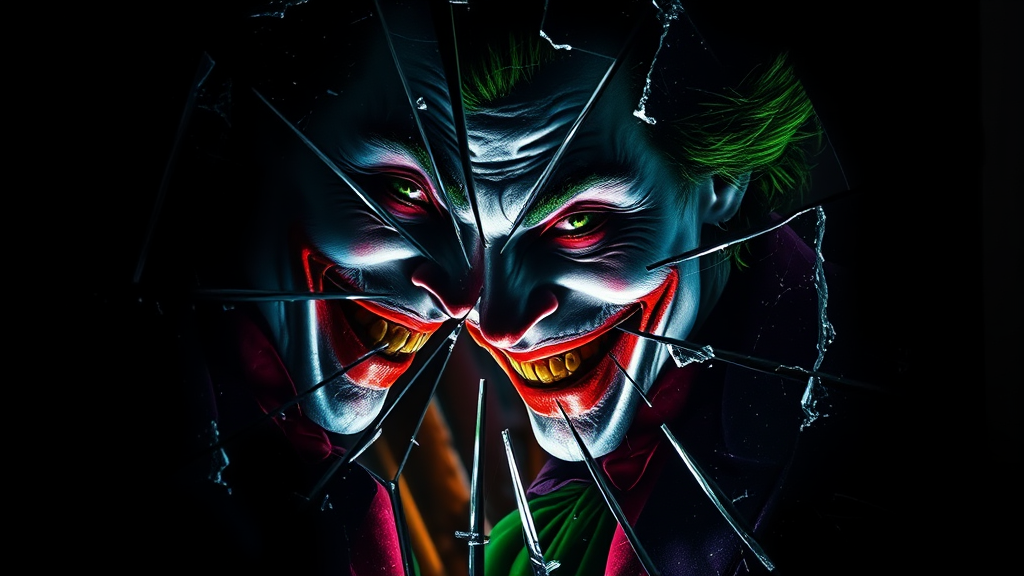 The Joker, a notorious villain from the Batman series, gazes into the fractured shards of a mirror, crafted in the cinematic style of Christopher Nolan. The scene is enveloped in an intense atmosphere of foreboding and horror, illuminated by stark, dramatic lighting. This hyper-realistic portrait captures an astonishing level of detail, with hidden elements woven throughout the composition. The Joker's reflection, distorted by the fragmented glass, reveals his chaotic smile and maniacal eyes, set against a backdrop rich in deep shadows. Vivid colors emerge amidst the darkness, showcasing colorful realism with extraordinary precision. Every crease in his suit, every smudge of makeup, is meticulously rendered, creating a breathtakingly detailed, ultra-high-definition 8K image suitable for a wallpaper. The scene resonates with vivid realism and a haunting allure, drawing viewers into its mesmerizing detail and complexity.
