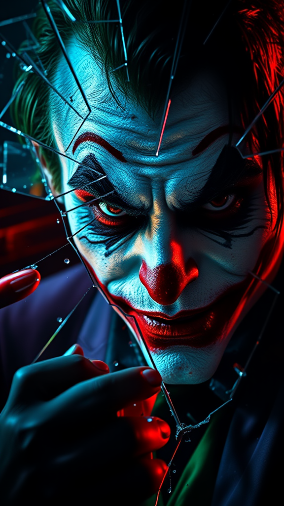 The Joker, a sinister antagonist from the Batman saga, gazes intensely into a shattered mirror, exuding an aura crafted in the visionary style of Christopher Nolan. Enveloped in a dynamic atmosphere of shadows and dread, the scene is illuminated with dramatic lighting, casting intricate reflections across his face. Every detail is exquisitely rendered with hyper-realistic precision, capturing the madness in his eyes and the chaotic patterns of his smeared makeup. The shattered fragments of glass create a kaleidoscope of distorted imagery, each shard offering a fragmented glimpse into the Joker’s fractured psyche. Vibrant hues dance across the scene, enhancing the colorful realism that contrasts starkly with the dark undertones. The wallpaper-worthy portrait is a mesmerizing collision of terror and beauty, realized in UHD, 8K, revealing hidden nuances and deliberate intricacies that invite viewers into a nightmare of malevolent artistry.