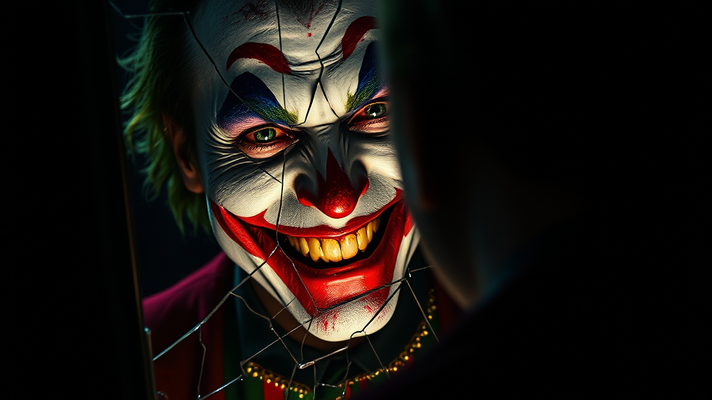 The Joker gazes into a fractured mirror, the shards reflecting his chaotic grin in disjointed fragments, evoking a sense of madness within a dark, atmospheric setting. The scene is crafted in the cinematic style reminiscent of Christopher Nolan, with dramatic lighting casting sharp shadows across his face, enhancing the sinister ambiance. The intricate details of the Joker’s face are captured in hyper-realistic precision, each wrinkle and smear of face paint telling its own story. The surrounding room is cloaked in darkness, yet punctuated with hidden elements that suggest a deeper narrative. The visual composition is a masterclass in colorful realism, with vivid hues starkly contrasting against the bleak surroundings. Every pixel is rendered in ultra-high definition, offering an 8K resolution that heightens the realism, inviting viewers to lose themselves in the Joker’s twisted world, as if each crack in the mirror holds a secret waiting to be uncovered.