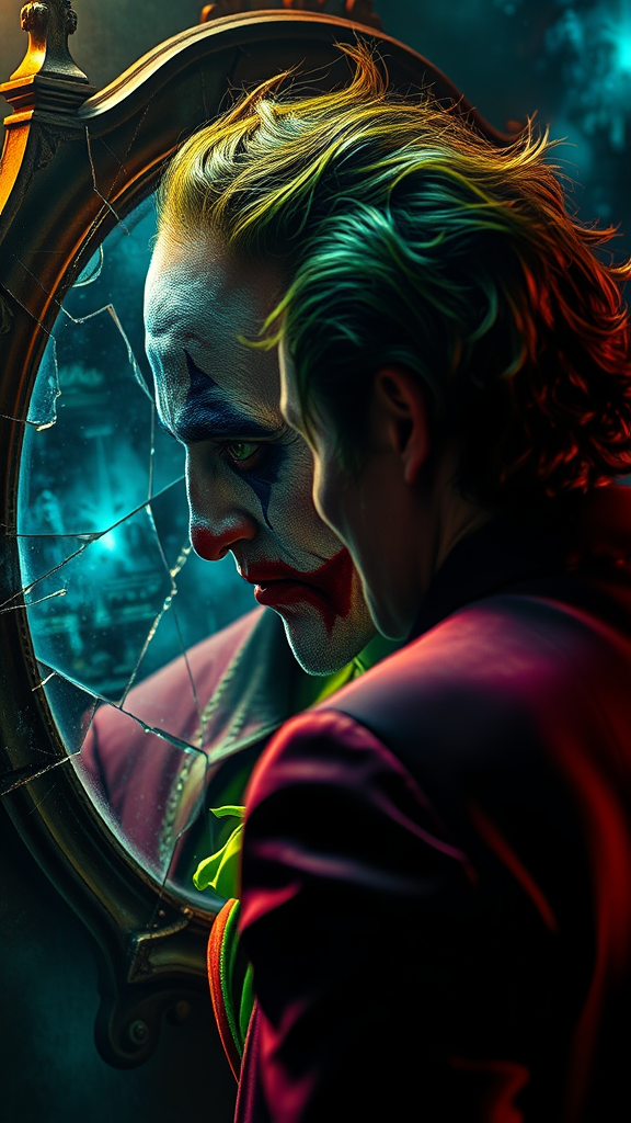 The Joker, notorious villain from the Batman series, stands before a fractured mirror, immersed in an atmosphere crafted by Christopher Nolan, where darkness and horror reign. A dramatic interplay of light and shadow reveals his chaotic reflection in hyper-realistic detail. The scene bursts with vibrant yet unnerving colors, drawing the viewer into a world laced with hidden elements and subtle symbolism. Every detail of the Joker’s face, from the sinister curl of his lips to the intensity of his eyes, is meticulously rendered, capturing the madness within. The surrounding environment pulsates with dynamic tension, rich in texture and layered intrigue, offering a tapestry of colorful realism that borders on the surreal. An 8K visual feast, this haunting portrait serves as a window into the complex psyche of crime's most colorful mastermind.