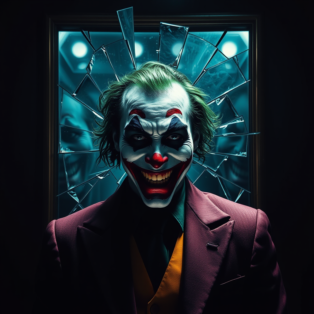 The Joker stands before a shattered mirror, fragmented reflections of his painted face casting haunting echoes in the dimly lit room, reminiscent of Christopher Nolan's gripping style. Darkness coils around him, an atmosphere thick with horror and tension. The dramatic interplay of light casts sharp contrasts, illuminating the intricacies of his smeared makeup and twisted grin in stunning, hyper-realistic detail. Each shard of glass reveals a different facet of his chaotic mind, a tapestry of madness and brilliance, rich with hidden symbols and cryptic nuances. The scene is a vivid mosaic of colorful realism, every detail meticulously rendered in ultra-high definition, an 8K spectacle that draws the viewer into a world where order teeters on the edge of chaos.
