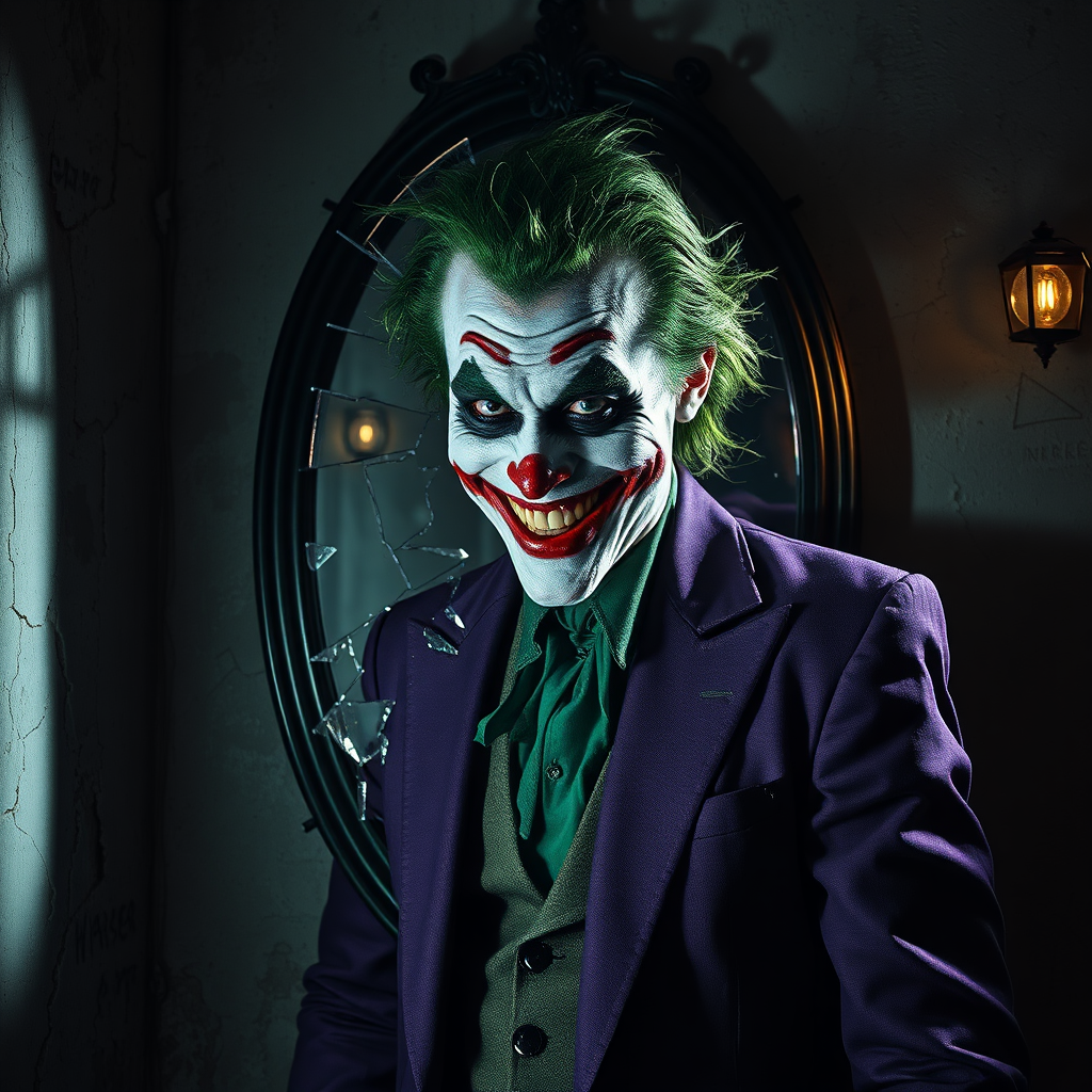 The Joker stands before a shattered mirror, his twisted smile reflected in a kaleidoscope of jagged shards, each piece capturing a fragment of his chaotic persona. The scene is set in a dimly lit, decrepit room, where shadows dance along the cracked walls, adding to the atmosphere of unsettling horror. The light sources flicker sporadically, casting dramatic highlights and deep shadows, emphasizing the Joker's smeared makeup and malevolent gaze. The environment is meticulously detailed, with hidden symbols and esoteric graffiti etched into the peeling paint and worn surfaces, hinting at the depth of his madness. The hyper-realistic texture of his purple suit and sickly green hair contrasts sharply with the gritty backdrop, rendered in ultra-high definition. This portrait captures the anarchic essence of the character, blending colorful realism with an intense, haunting realism that demands attention.