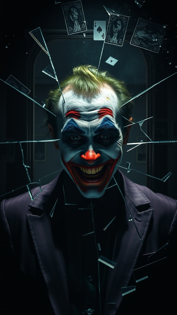 The Joker stands before a shattered mirror in a dimly lit room, his reflection fragmented and distorted. The scene is enveloped in an atmosphere of dark suspense and unsettling horror, reminiscent of Christopher Nolan's moody and intricate storytelling. Dramatic lighting casts sharp shadows across his painted face, highlighting the chaotic blend of vivid colors and smeared makeup. Each shard of glass captures a unique angle of his twisted smile, adding layers of mystery and depth. The room is filled with hidden details hinting at his chaotic mind—a solitary playing card, faded photographs, cryptic symbols etched into the walls. The hyper-realistic texture of his skin and makeup is rendered in stunning UHD 8K, with an extraordinary attention to detail emphasizing every crease and pore. This colorful realism creates a striking contrast against the dark background, making the image pop as a dynamic, haunting portrait suitable for a wallpaper, capturing the essence of the Joker in a world teetering on the brink of madness.