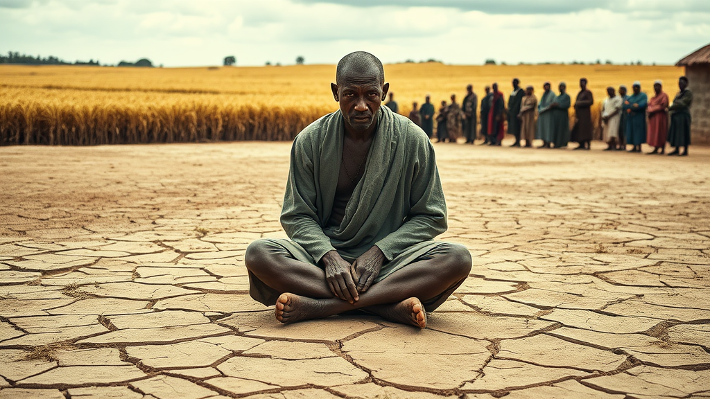 The King, a man in his late 50s with a regal yet weary appearance, sits cross-legged on the bare, cracked earth of the once-grand courtyard in Olungwe. His gaunt cheeks, etched with unending tears, are testament to his inner turmoil. His freshly shaved head reveals a battle-worn scar, a haunting reminder of his past conflicts. Draped in tattered robes of somber gray, he embodies despair itself. Surrounding him, the expansive golden fields of his kingdom seem to have lost their luster, their once proud stalks now bowing under a heavy, oppressive sky. In the distance, villagers clad in muted colors watch in hushed solemnity, their faces a mixture of fear and reverence. A gentle breeze stirs the dust at the king's feet, carrying with it the soft whispers of sorrow that echo throughout the land.