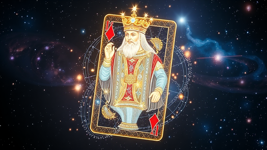 The King of Diamonds card metamorphoses into a 3D hologram composed of cosmic energy. As the King manifests, stars and galaxies whirl around him, evoking a sensation of journeying through the cosmos. His regal attire is embellished with celestial motifs, and his crown is an effulgent star cluster. The hologram levitates before you, the backdrop morphing through various cosmic vistas, from dazzling nebulae to the mysterious depths of black holes. Ideal for space-themed gatherings, science fiction conventions, or futuristic technology exhibitions.