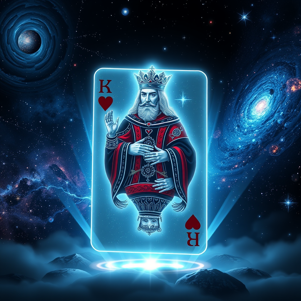 The King of Hearts card materializes into a 3D hologram, radiating cosmic energy. As the King emerges, he is surrounded by swirling stars and galaxies, creating a sensation of voyaging through the cosmos. His regal attire is embellished with intricate celestial motifs, and his crown glows with the brilliance of a star cluster. The hologram hovers before you, while the backdrop shifts through an array of mesmerizing cosmic vistas, from shimmering nebulae to enigmatic black holes. Ideal for space-themed events, sci-fi gatherings, or cutting-edge tech expos.