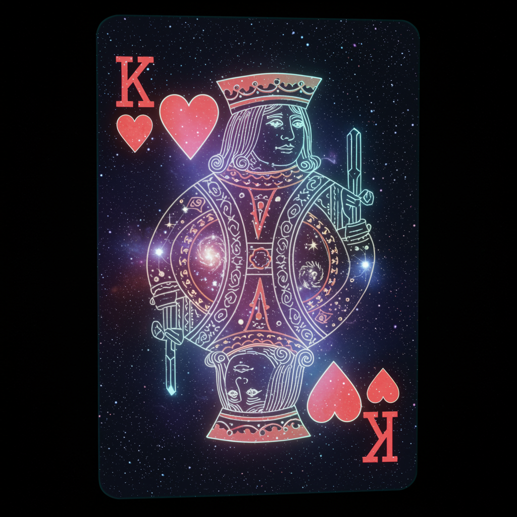 The King of Hearts card morphs into a 3D hologram composed of cosmic energy. As the King emerges, stars and galaxies whirl around her, creating a sensation of voyaging through the cosmos. The King's garments are embellished with astral motifs, and her crown sparkles as a radiant constellation. The hologram glides in front of you, with the backdrop shifting through various cosmic landscapes, from swirling nebulae to mysterious black holes. Atmosphere: Ideal for space-themed galas, science fiction festivals, or avant-garde tech exhibitions.