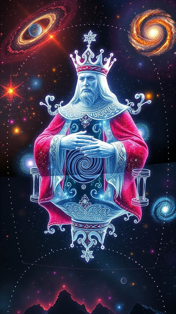 The King of Hearts card morphs into a magnificent 3D hologram, crafted from ethereal cosmic energy. As the regal figure materializes, clusters of stars and spiraling galaxies orbit around him, conjuring the enchanting sensation of journeying through the cosmos. His regal attire is embellished with intricate celestial motifs, and his crown radiates like a luminous cluster of stars. Suspended before you, the hologram dances against a dynamic backdrop of cosmic vistas, transitioning from vibrant nebulae to mesmerizing black holes. Ideal for events steeped in space themes, sci-fi conventions, or cutting-edge tech showcases.