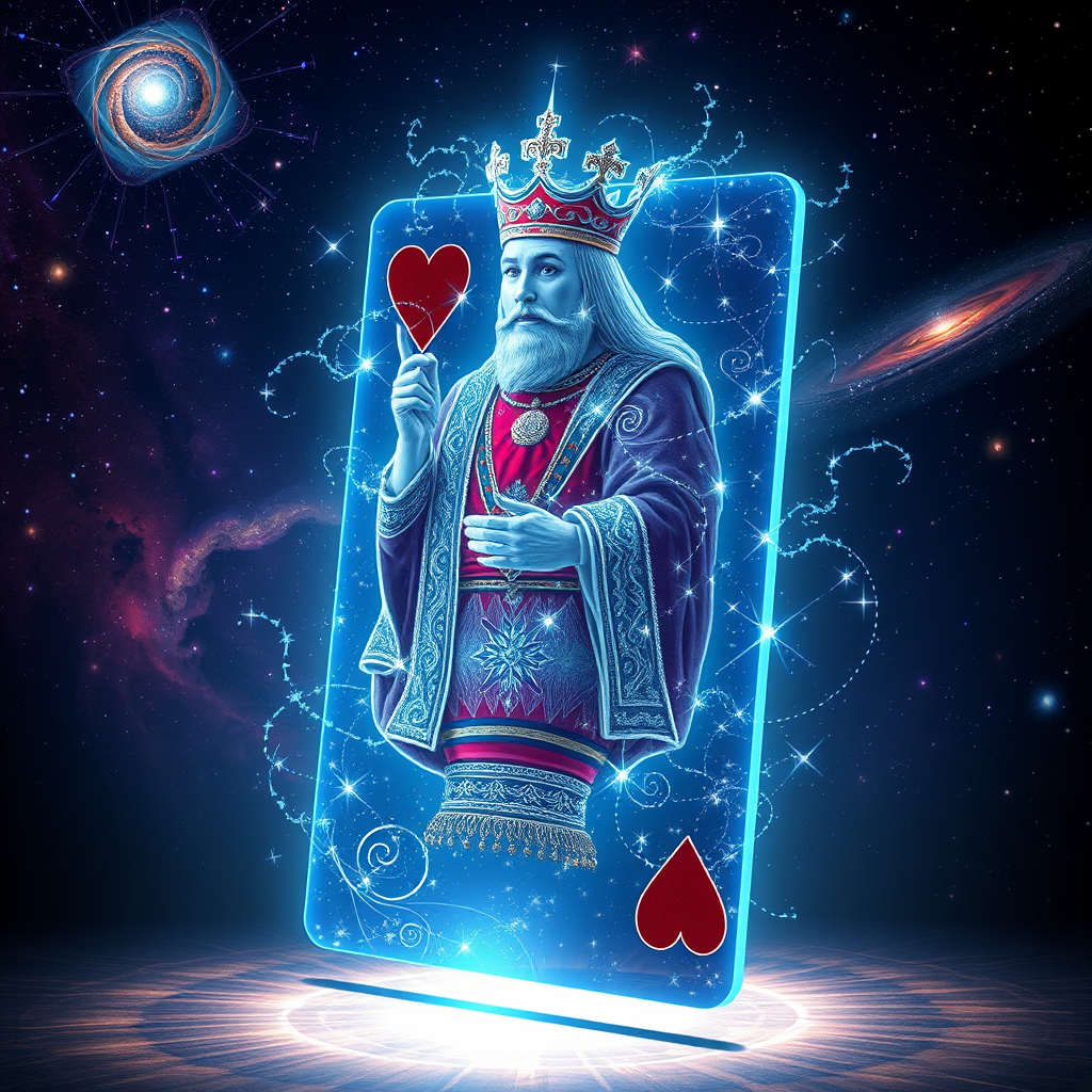 The King of Hearts card morphs into a mesmerizing 3D hologram composed of cosmic energy. As the King arises, stars and galaxies spiral around him, evoking a sense of voyaging through the cosmos. His regal attire is embellished with intricate celestial designs, and his crown radiates as a cluster of luminous stars. The hologram hovers before you, with the backdrop transitioning through a series of cosmic vistas: ethereal nebulae, swirling black holes, and distant quasars. Ideal for space-themed gatherings, sci-fi conventions, and cutting-edge tech exhibitions.