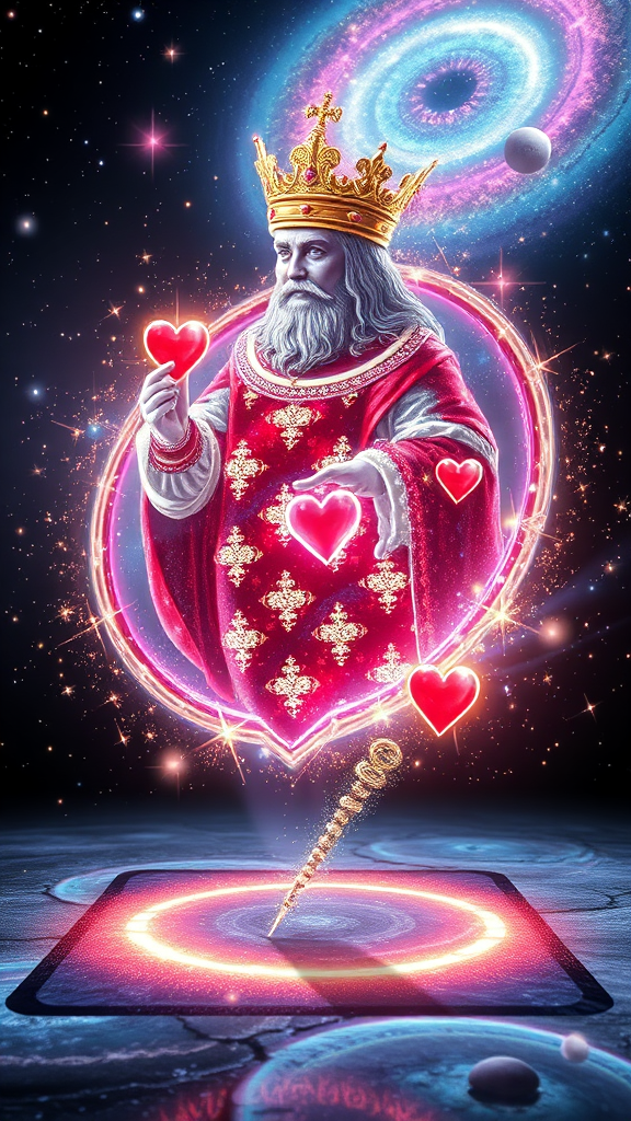 The King of Hearts card transforms into a mesmerizing 3D hologram composed of swirling cosmic energy. As the King materializes, a cascade of stars and luminous galaxies orbit around him, evoking a sensation of journeying through the universe. His attire glistens with celestial motifs, and atop his regal presence sits a radiant crown resembling a cluster of stars. This ethereal hologram hovers in front of you, with its backdrop continuously morphing through a succession of cosmic wonders, including vibrant nebulae and mysterious black holes. An atmosphere perfect for space-themed gatherings, science fiction conventions, or cutting-edge tech expos.