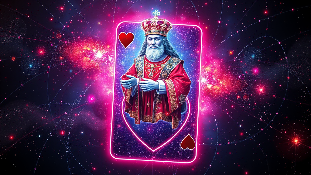 The King of Hearts card transforms into a vibrant 3D hologram composed of cosmic energy, bursting with radiant colors. As the King emerges, an array of stars and galaxies envelops him, creating the sensation of a voyage through the universe. His attire is intricately designed with celestial motifs, and his crown glimmers as a dense cluster of luminous stars. The hologram hovers in front of you, with the backdrop dynamically transitioning through a series of cosmic tableaux, from swirling nebulae to the enigmatic depths of black holes. Ideal for cosmic-themed events, sci-fi gatherings, or advanced tech showcases.