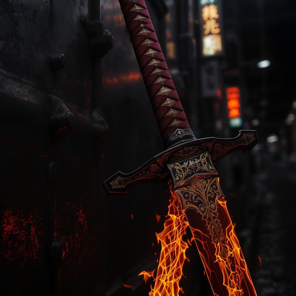 The legendary swords of the dragonborn, crafted in neo-traditional Japanese style, exuding the intricate artistry of Magali Villeneuve. This scene captures a close-up intensity, blending urban and edgy elements with the unique flair of Xiaofei Yue. The blades gleam with dark crimson and fiery orange hues, reminiscent of a smoldering ember. The setting is infused with a traincore aesthetic, merging industrial grit with elegance, encapsulating a world where tradition meets modernity, shadowed in a mysterious allure.