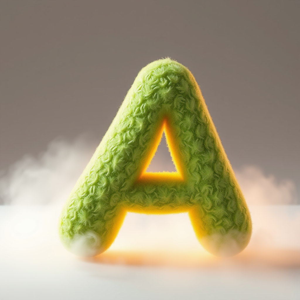 The letter A crafted from a rich avocado texture, rendered in a high-quality fluffy 3D style using blender and unreal engine, with intricate details and enhanced by dynamic volumetric lighting, showcasing a smooth, organic appearance that evokes a fresh, natural vibe, surrounded by a soft atmospheric glow, providing a captivating visual experience.