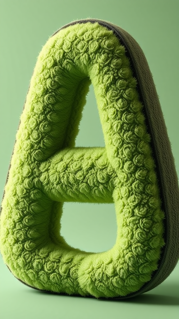 The letter A crafted from an avocado-like surface, showcasing a plush and three-dimensional form, rendered with Blender and Unreal Engine, featuring high-definition details and enveloped in soft, volumetric lighting, embodying a lush, organic texture.