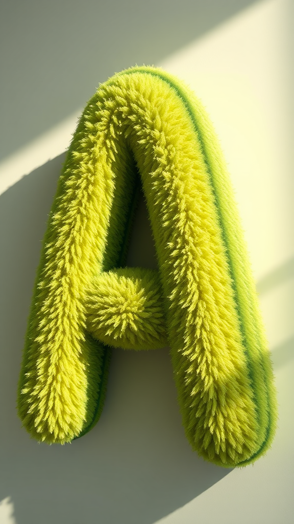 The letter A sculpted with the luscious texture of ripe avocado, rendered in a fluffy 3D style using Blender and Unreal Engine, featuring exquisite detail and high quality, surrounded by soft, volumetric lighting that casts gentle shadows, evoking a sense of freshness and creativity.