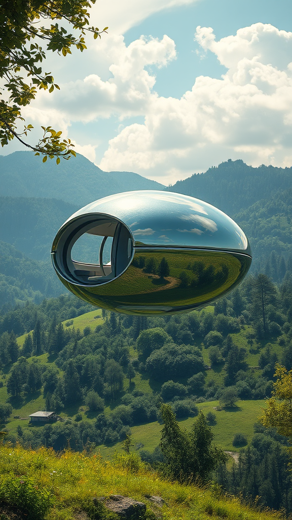The levitating pod house drifts gracefully above the verdant landscape, its sleek, reflective surfaces catching the sunlight as it sways gently in the breeze, connected only by invisible threads of advanced technology to the earth below.