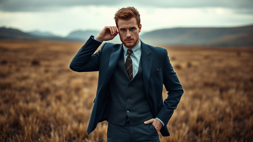 The man in the field strikes a poised, camera-ready stance, his attire echoing the style of Daria Endresen and Kris Knight, amidst sweeping Scottish landscapes. His outfit is a sophisticated blend of light navy and dark brown, reminiscent of Georg Jensen's timeless elegance. The scene is captured with intense close-ups that reveal every detail, with a matte finish enhancing the depth and mood. The aspect ratio of 132:161 frames him perfectly, encapsulating the serene yet compelling ambiance.