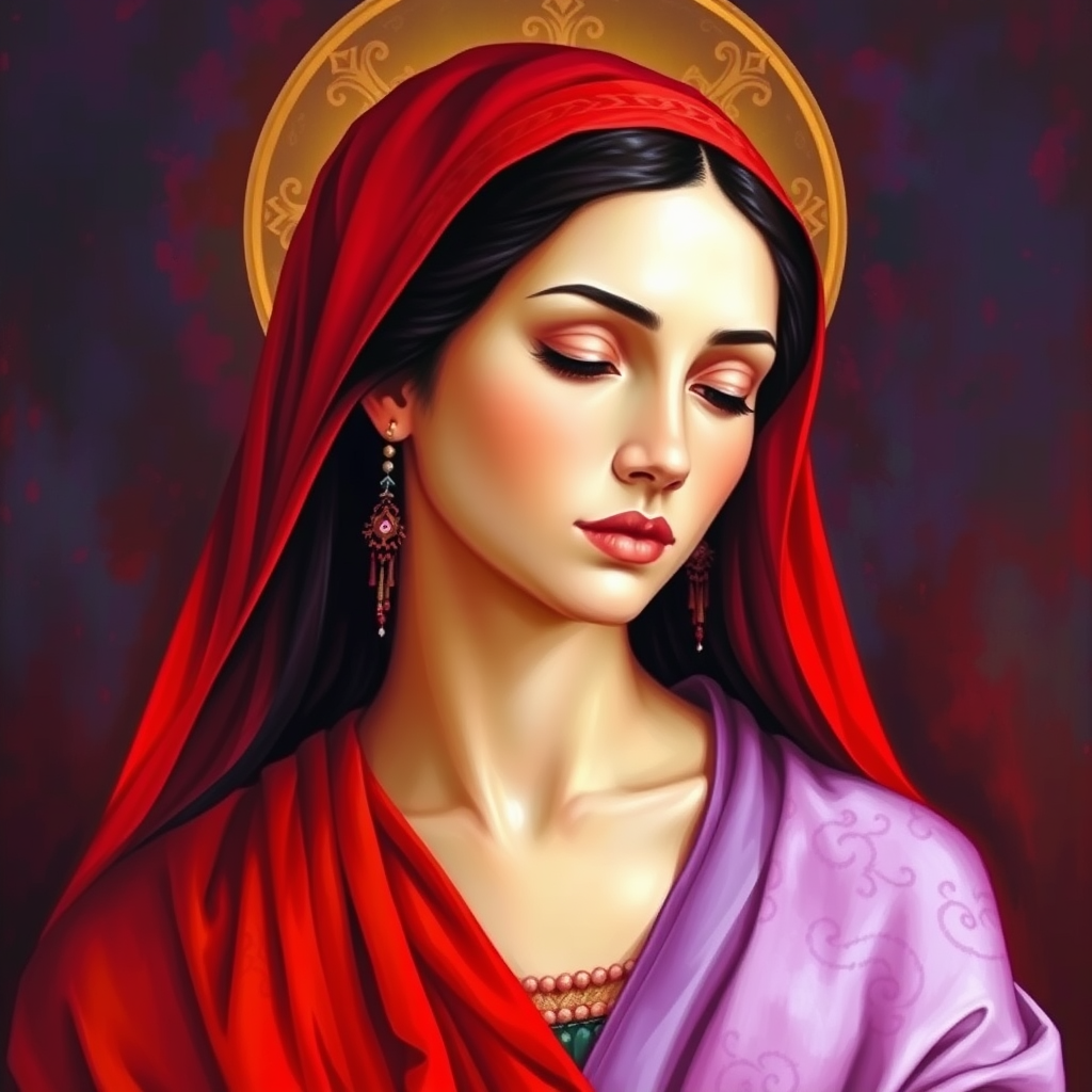 The Mary painting, rendered in a harmonious palette of light red and purple, encapsulates the mystical allure of a tarot card. The artwork emphasizes intricate facial features, drawing inspiration from the evocative style of Haifa Zangana and the rich cultural artistry of Tonga. With meticulous attention to realistic details, the piece resonates with a timeless quality reminiscent of Ann Stookey's touch. The composition maintains an aspect ratio of 105:128, inviting the viewer into a world where spirituality and artistry converge.
