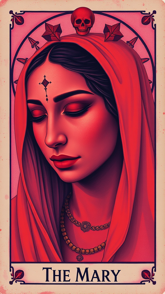 The Mary painting, rendered in light red and purple hues, resembling a tarot card with intricate and detailed facial features, inspired by Haifa Zangana's influences and the art of Tonga, showcasing realistic attention to detail, reminiscent of Ann Stookey's style, with subtle creative enhancements to maintain the original essence.