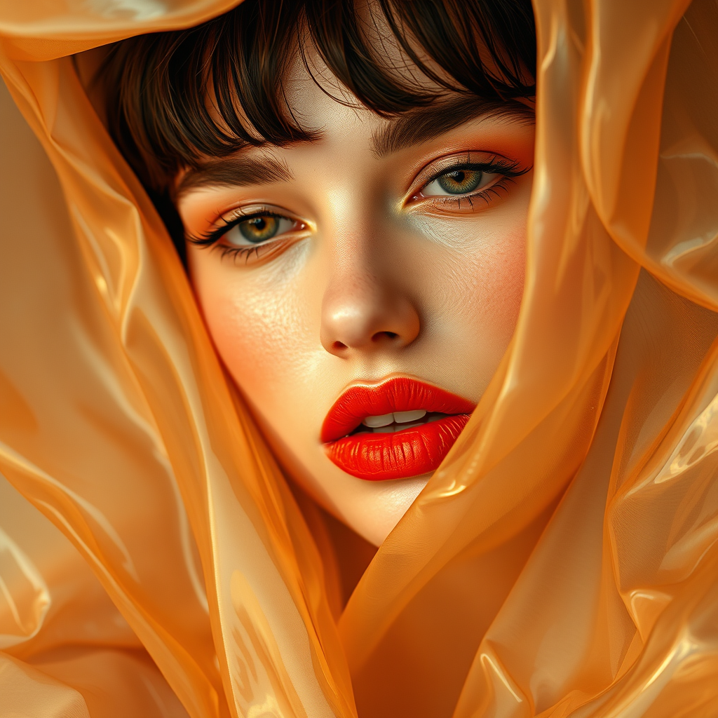 The model showcases vibrant orange lipstick and mascara, evoking the essence of Marilyn Minter's aesthetic, intertwined with animated gif-like fluidity and the precision of macro photography, reminiscent of Yigal Ozeri's detailed art. The scene exudes monochromatic serenity, washed over with soft hues of light beige and amber, layered against undulating sheets that mimic wavy resin. Captured with the clarity of a Fujifilm X-T4 and the depth of a Sony FE 85mm f/1.4 GM lens, the image immerses in a harmonious blend of light brown and amber, retaining a raw, high-resolution texture that highlights the serene allure of the composition.