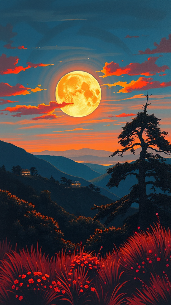 The moonlight flourishes over a serene landscape, capturing the essence of bay area figurative art, with vibrant hues of orange and the realism of figure painting. The scene embodies dynamic landscapes in motion, reminiscent of Whistlerian subtlety blended with hints of Phoenician artistry. Crimson and blue tones weave through the composition, creating a harmonious dance of color and light.