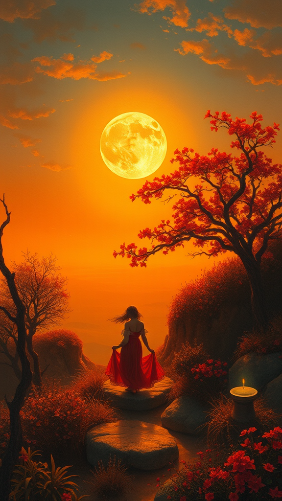 The moonlight in bloom casts an ethereal glow over a serene landscape, captured in the style of Bay Area Figurative Art. A harmony of orange hues envelops the realistic figures, their forms intertwined with the dynamic essence of landscapes in motion. The scene evokes a Whistlerian quality, infused with touches of ancient Phoenician artistry. Rich tones of crimson intertwine with vibrant blues, creating a vivid tapestry of color and emotion.