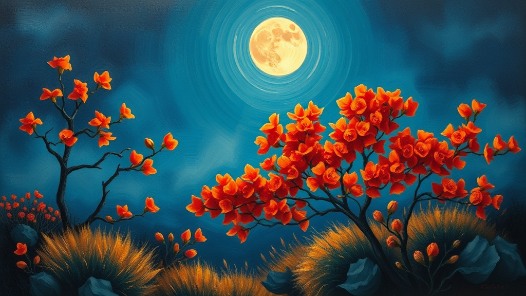 The moonlight in bloom illuminates a serene landscape, captured in the style of Bay Area figurative art with a focus on realist figures. Hues of orange and crimson blend seamlessly with deep blues, creating a dynamic, motion-filled scene reminiscent of Whistlerian aesthetics fused with Phoenician influences. The painting portrays a harmonious balance between stillness and movement, enveloped in a dreamy, ethereal glow.