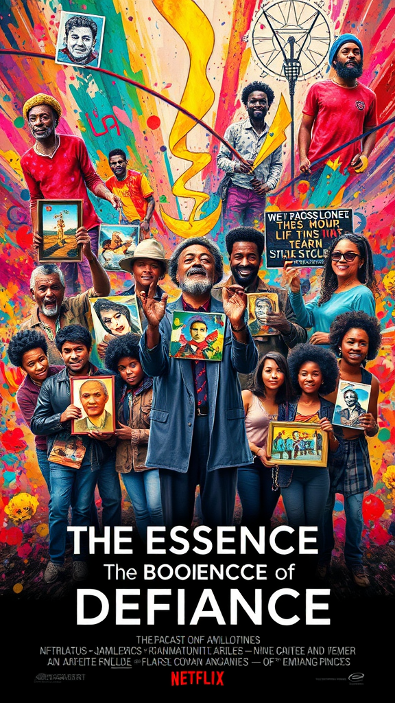 The movie poster for "The Essence of Defiance" showcases a vibrant ensemble of artists and cultural icons, each grasping a distinct piece of art emblematic of their individual movements and battles. The backdrop is a dynamic explosion of colors, blending both abstract and realistic art forms. The overall aura of the poster is uplifting and emboldening, honoring the transformative power of art and creativity in overcoming challenges.
