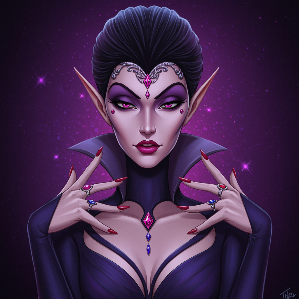 The next Disney villain is a dark elf queen, possessing an otherworldly beauty that surpasses any Disney princess. Her face is adorned with intricate, gleaming jeweled art that reflects her regal nature. She wears strappy heels that echo her elegant and fierce demeanor and a dress with a plunging neckline that enhances her allure. Her face shows a mischievous charm reminiscent of the most captivating anime characters, rendered in classic Disney animation style. The image is a high-quality painting, showcasing her in stunning detail with Ultra High Definition, highlighting every facet of her ethereal beauty. Additionally, her design includes a slight blend of fantasy and realism, featuring her long, graceful neck and hands adorned with bejeweled rings, hinting at her mystical powers.
