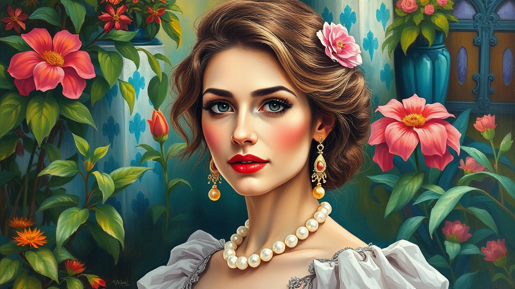The painting captures the essence of elegance and vitality, displaying the woman's face and attire with meticulous detail. Every hue is vibrant and lively, blending strong and subtle tones to infuse the garden with life. The brushstrokes exude a dynamic and spirited quality, mirroring the woman's youthful energy and zest.