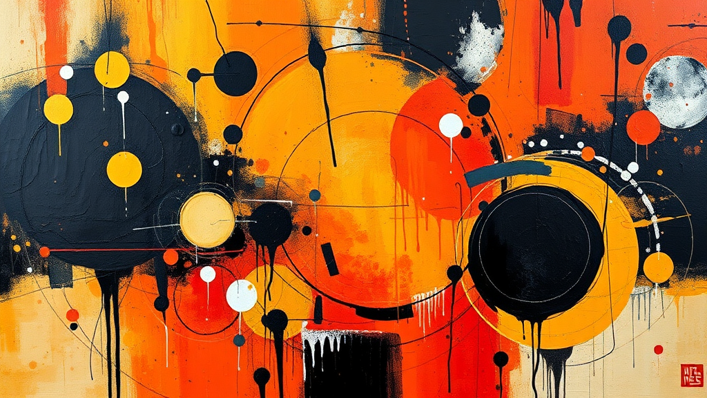 The painting features a dynamic interplay of orange, black, and yellow hues, capturing the essence of complex compositions with an infusion of dark white and light red tones. Drawing inspiration from Dmitry Spiros, it incorporates industrial materials and balanced proportions, characterized by circular abstraction. The style reflects hard-edge painting with a slightly modified touch, blending harmony and contrast to create a visually striking piece.