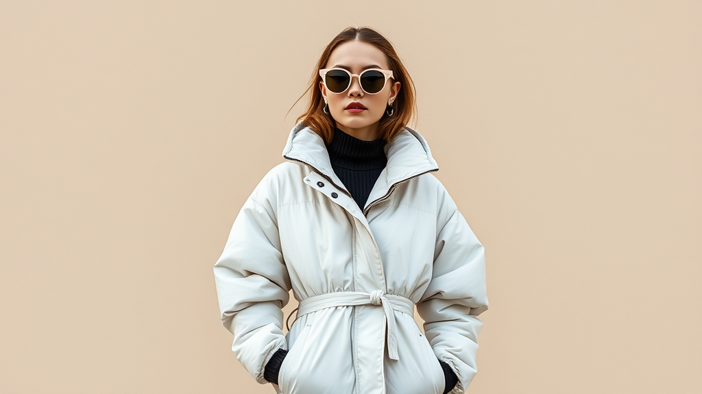 The photo features a woman standing against a muted beige backdrop, embodying a popular Tumblr aesthetic. Her look consists of a chic reflective puffer jacket layered with a poncho, both in a trendy off-white hue. This outfit could nod to a viral internet meme or fashion trend and is currently making waves on the design website Dezeen. The image resembles a catalog shot, highlighting the forward-thinking fashion trends for 2024. Accessories include a stylish mac, a pair of sunglasses with 8.0 LV branding, and a distinctive folded piece by designers Mike and Wojtek Fus. This ensemble captures the essence of avant-garde fashion for the year and is designed to capture attention.