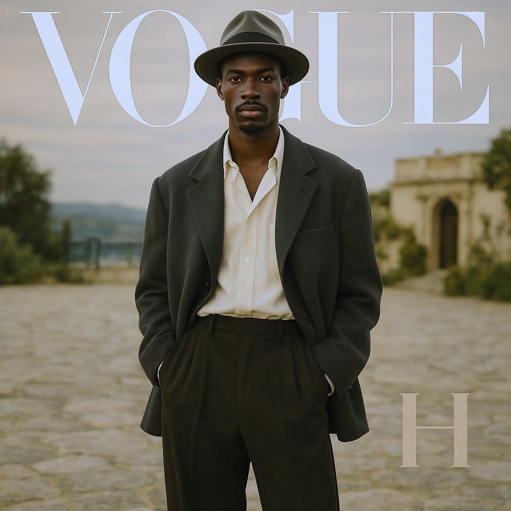 The picture portrays a gentleman standing nonchalantly with his hands nestled in his pockets, drawing inspiration from Eugène Brands. It's likely an Instagram photo from a Dior editorial, exuding a retro summer vibe. The man, reminiscent of Lance Reddick, dons oversized attire and a stylish hat. This image channels a Hermes advertisement and showcases 2020's fashion sense. It might have graced the pages of Vogue France as part of a lookbook or a profile highlight. The scene is imbued with hints of 50s elegance, potentially entitled "Gentle Soul."