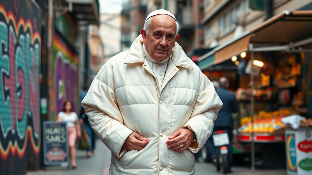 The pope, donning an oversized ivory puffer coat, strides confidently through the vibrant streets of the neighborhood, his serene expression contrasting with the urban backdrop of colorful graffiti and bustling market stalls.