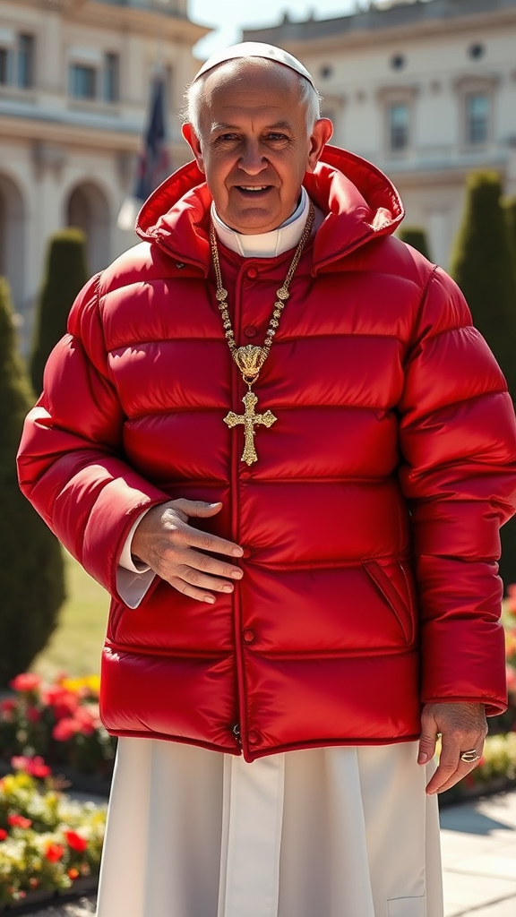 The Pope dons a striking full-length red shiny puffer jacket, adorned with intricate gold cross jewelry and resplendent gold rings, exuding an aura of modern elegance and timeless faith, as the sunlight glints off the luxurious fabric and precious metals, creating a harmonious blend of tradition and contemporary style amidst the backdrop of the Vatican gardens.