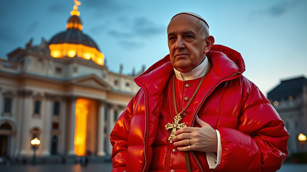 The Pope is adorned in a striking full-length red glossy puffer jacket, complemented by a radiant gold cross necklace and an array of lavish gold rings, exuding an aura of modern elegance and holy authority. He stands against a backdrop of a softly illuminated Vatican square, where the shimmer of the gold meets the vibrant red of the jacket, creating a captivating scene of contemporary style fused with timeless spiritual grace. The evening sky paints a serene setting, as subtle hints of evening stars glimmer in the distance, casting a divine aura around the pontiff.