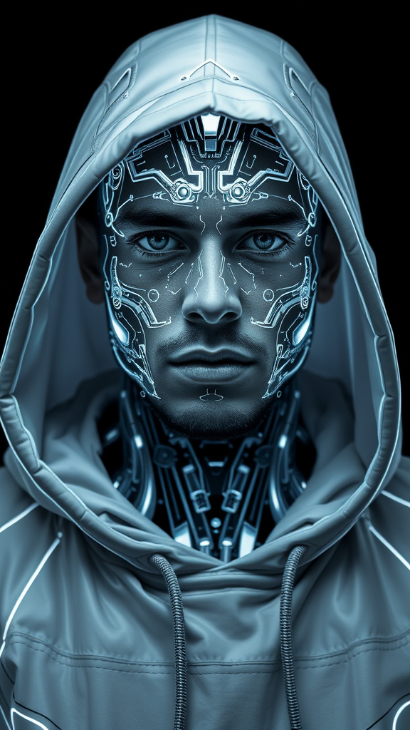 The portrait captures a white man wearing a sleek hoodie, his visage enveloped in the neon glow typical of cyberpunk aesthetics. His features are accentuated by intricate robotic motifs, blending seamlessly with his skin, creating an impression of fused humanity and machinery. The image is awash with a dark white and silver palette, reflecting the glossy sheen of the cyber landscape. The composition embodies controlled chaos, with elements of symmetrical asymmetry that invite the gaze to dance across the visual nuances. The photographic style mirrors that of an associated press photo, capturing the essence of this futuristic vision.