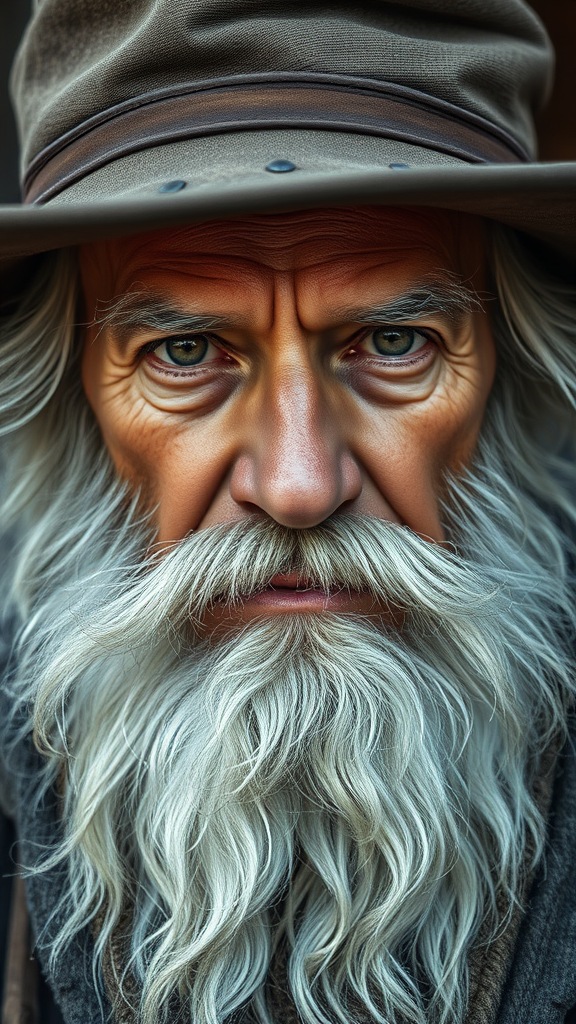 The portrait captures an elderly gentleman with a flowing silver beard and matching mustache, topped with a worn, weathered hat. His expression is serious, exuding wisdom and a lifetime of experiences. The focus on his facial features highlights the depth of his eyes and the commanding nature of his stern gaze, with his majestic beard lending him an air of distinction and authority.