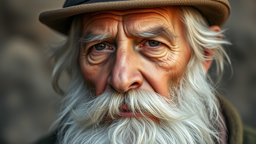 The portrait captures an elderly man with a flowing white beard and mustache, topped off with a distinctive hat. His expression is serious yet thoughtful, hinting at a life filled with wisdom and experience. The beard and mustache are striking features, enhancing his venerable and dignified appearance. A close-up angle highlights his facial features and the penetrating depth of his gaze, while subtle elements in his attire suggest a unique personal history.